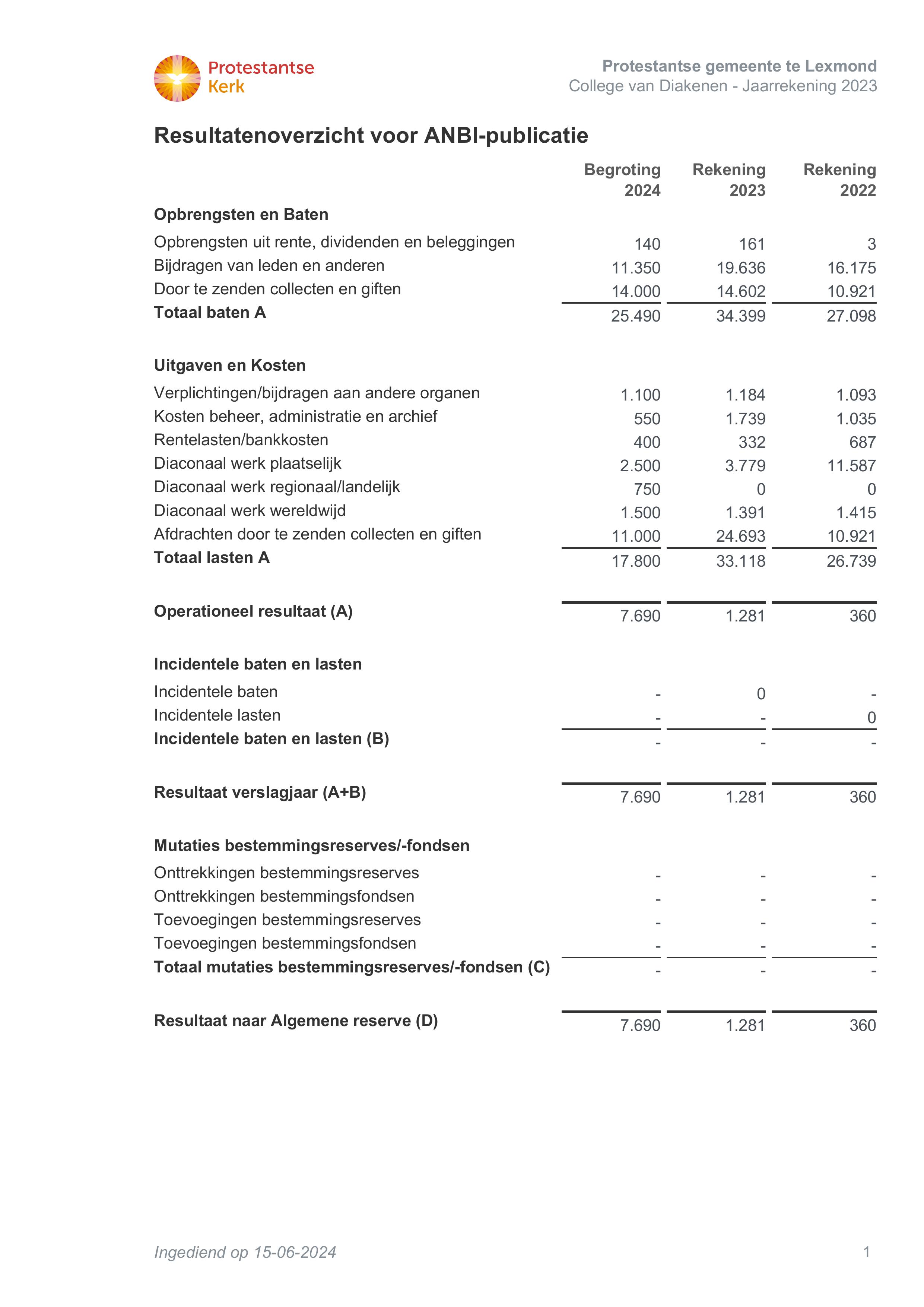Onderstaande staat van baten en lasten geeft via de kolom Begroting inzicht in de begrote ontvangsten en de voorgenomen bestedingen van de diaconie in het verslagjaar. De kolom Rekening geeft inzicht in de daadwerkelijk gerealiseerde ontvangsten en bestedingen.